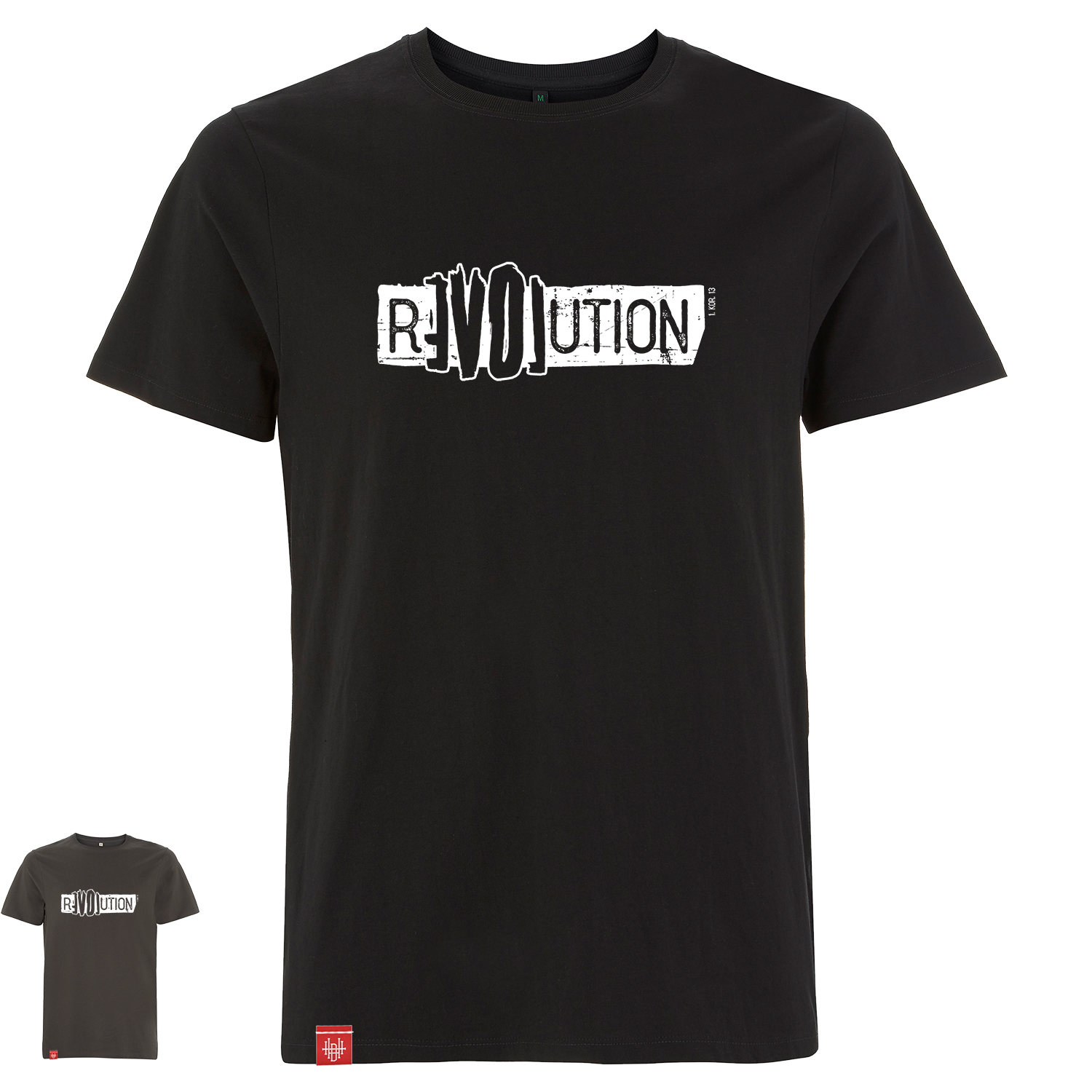 Auf diesem klassischen T-Shirt ist im Brustbereich der Schriftzug "Revolution" zu sehen. Dabei ist das rückwärts zu lesende Wort „LOVE“ hervorgehoben.