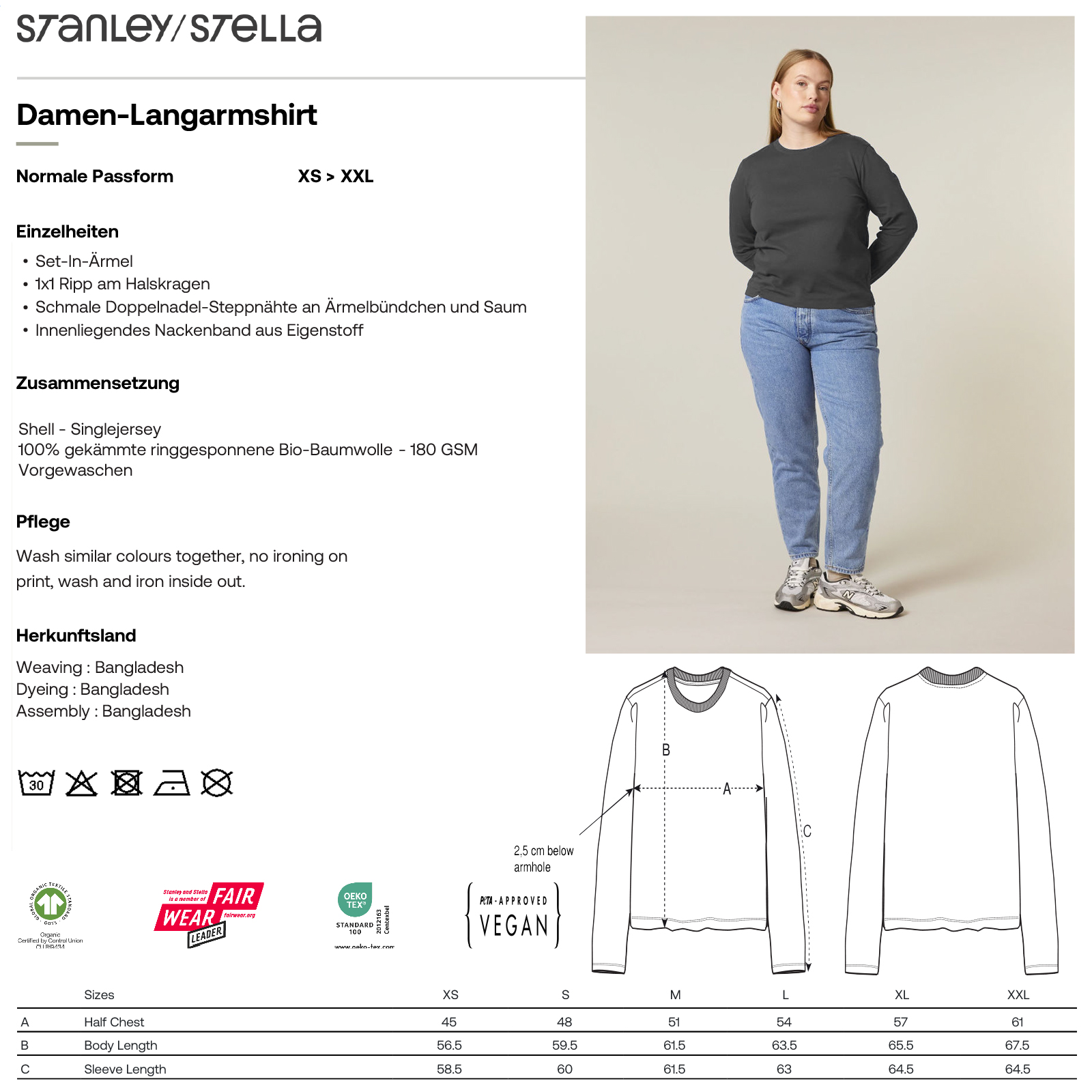 Stella Muser Langarm ist unser modernes Langarm-T-Shirt, das als vielseitiger Verbündeter in kühleren Witterungsbedingungen entworfen wurde. Mit seinem zeitlosen Design und der klassischen, normalen Passform ist es ein Fixstarter in der Garderobe von Damen aller Altersgruppen und Körpertypen. Es ist aus 100% Biobaumwolle in kompaktem Ringgarn angefertigt, was eine überlegene Qualität und eine selbst noch bessere Oberfläche für die Dekoration bietet.