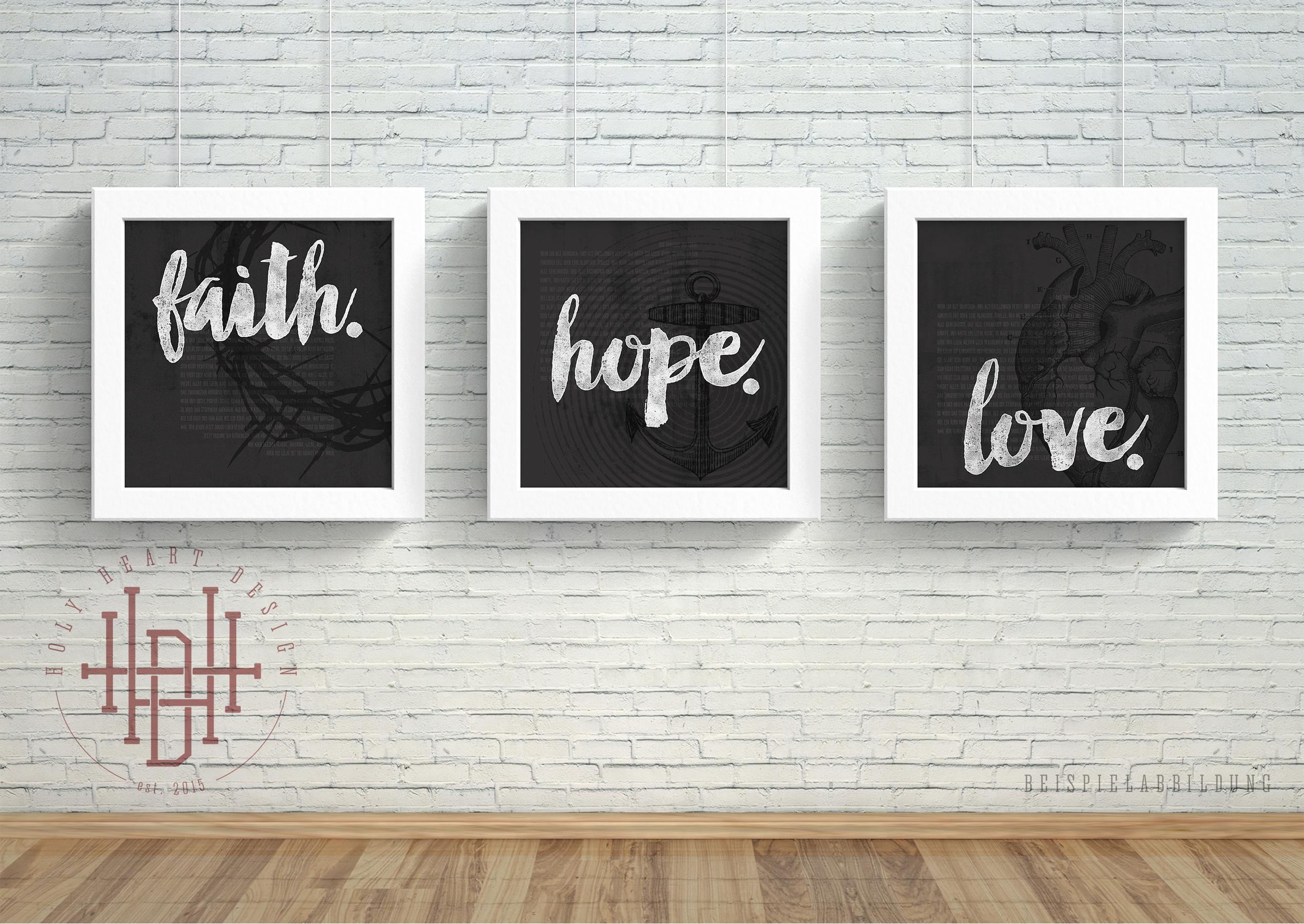 Hochwertiger Druck der Worte "Glaube – Hoffnung – Liebe" auf 3 quadratische Poster mit grauem Hintergrund. In diesem sind Auszüge aus dem Hohenlied der Liebe (Korinter 13) erkennbar.