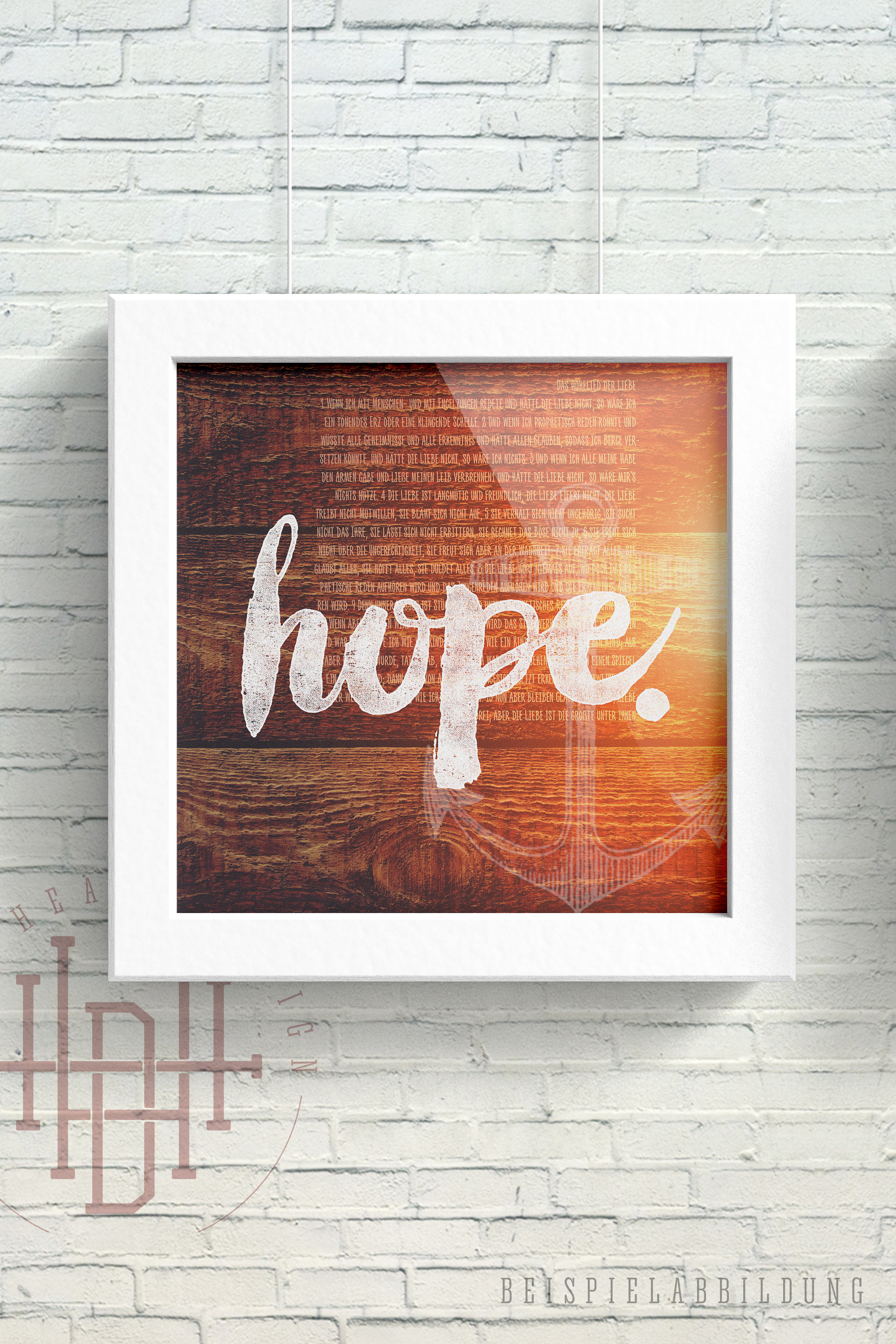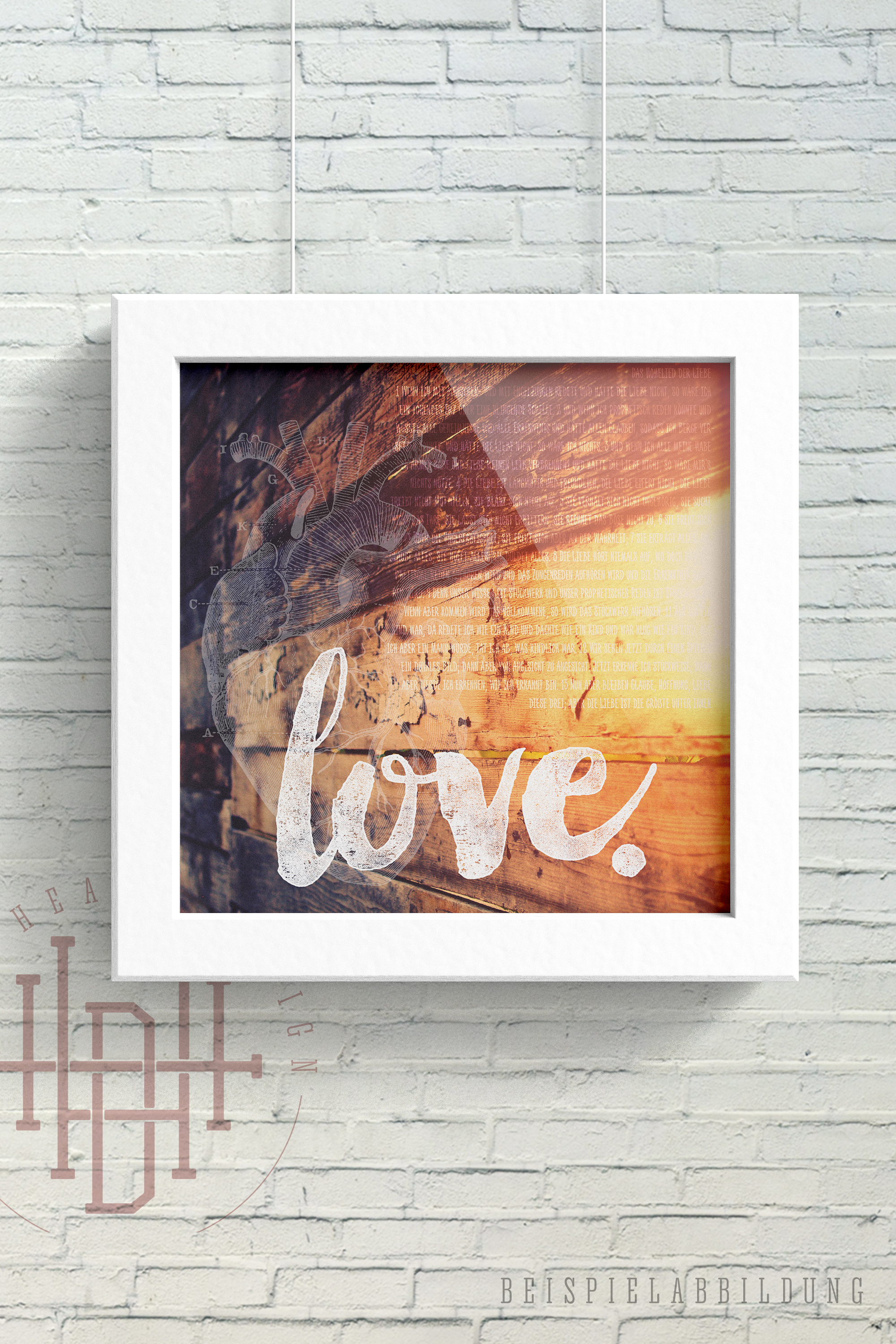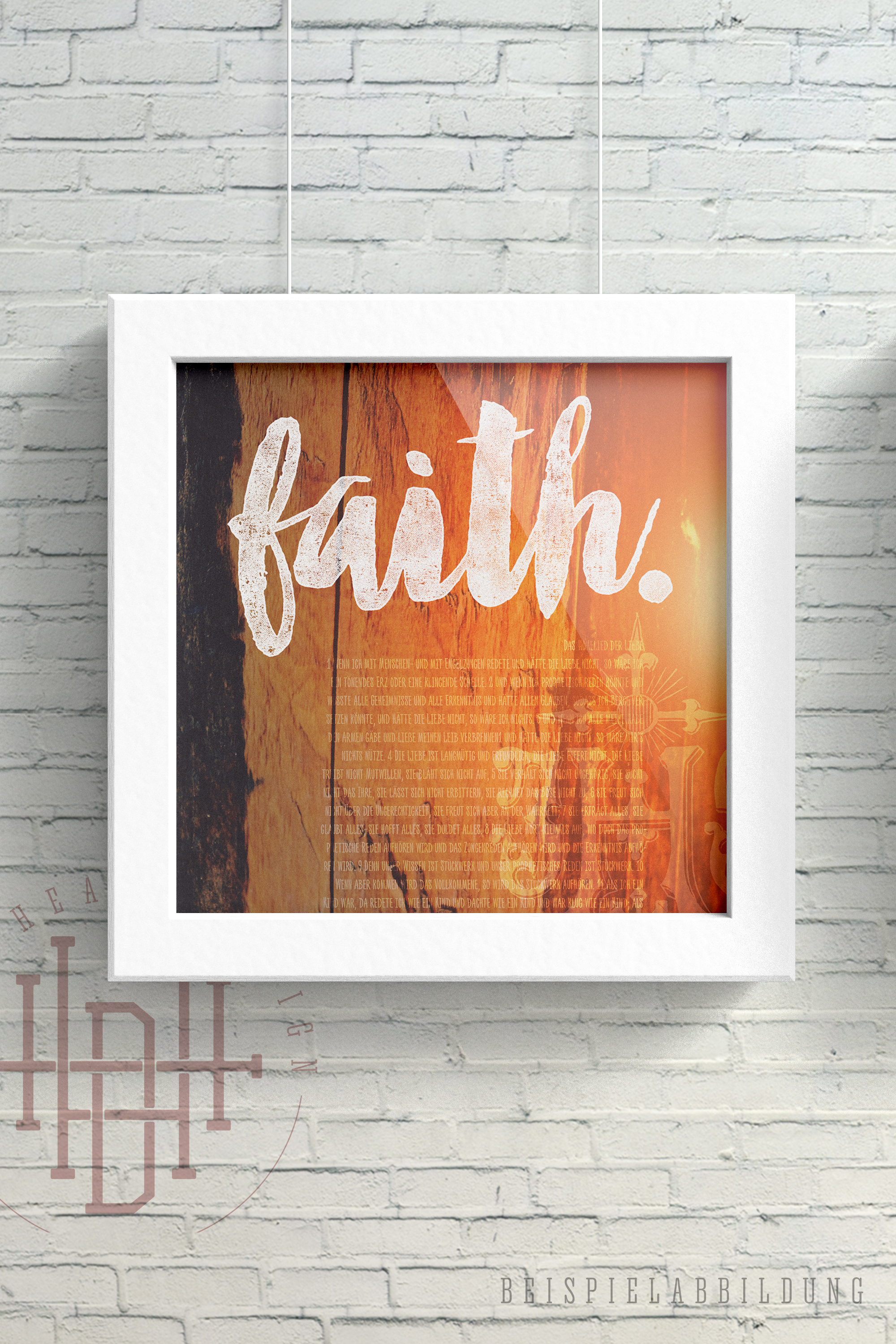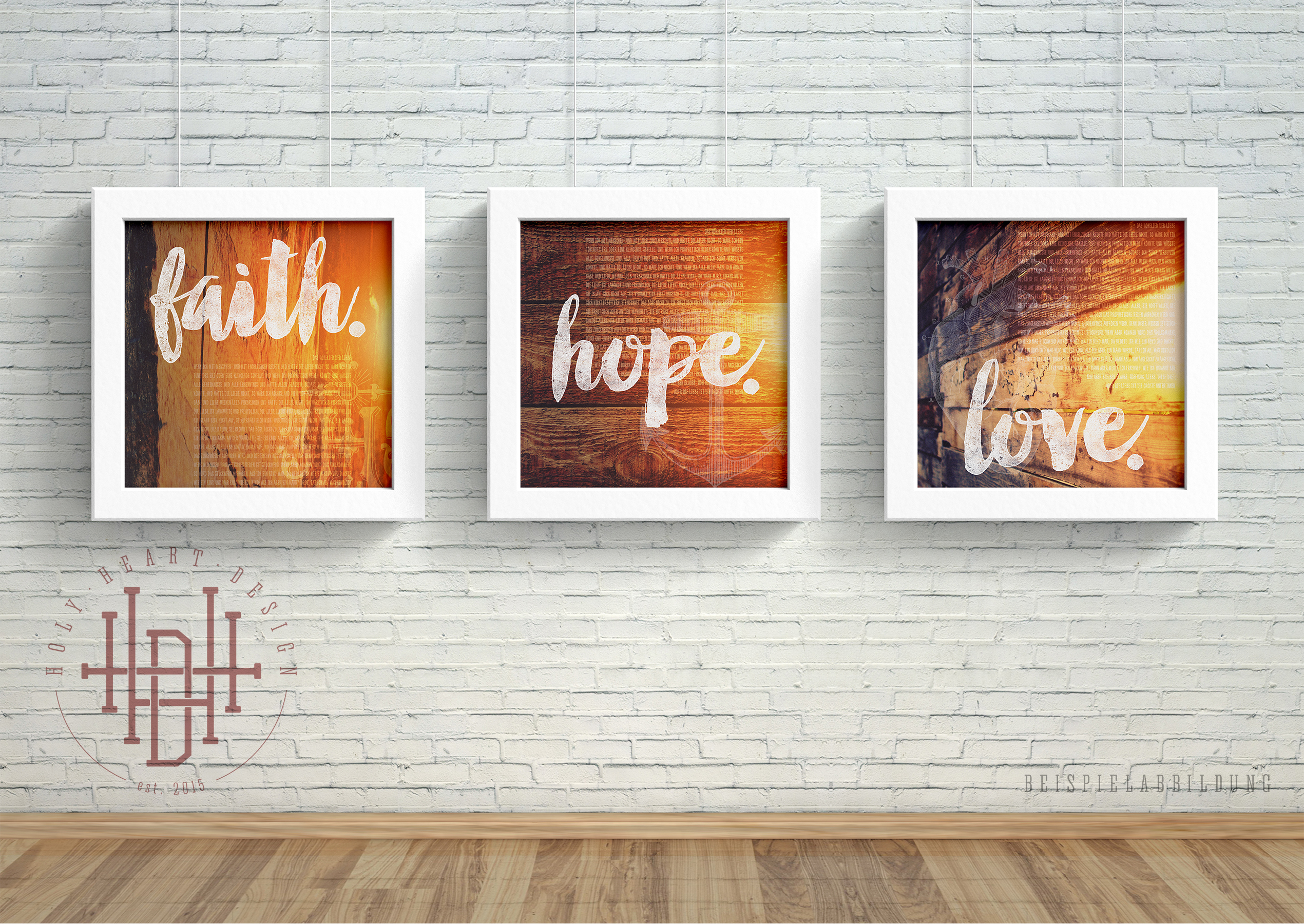 Hochwertiger Druck der Worte "Glaube – Hoffnung – Liebe" auf 3 quadratische Poster mit orangem Hintergrund. In diesem sind Auszüge aus dem Hohenlied der Liebe (Korinter 13) erkennbar.
